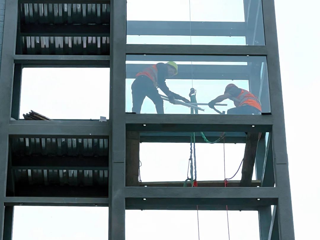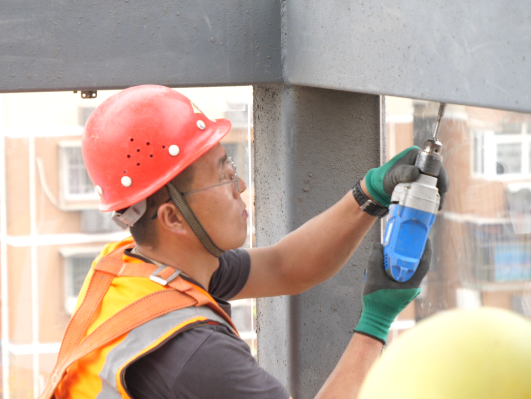 记者在双阳南区20号楼看到,这里建起了施工围挡,又一部加装电梯钢结构井道拼装完成,工程进入安装电梯玻璃阶段。